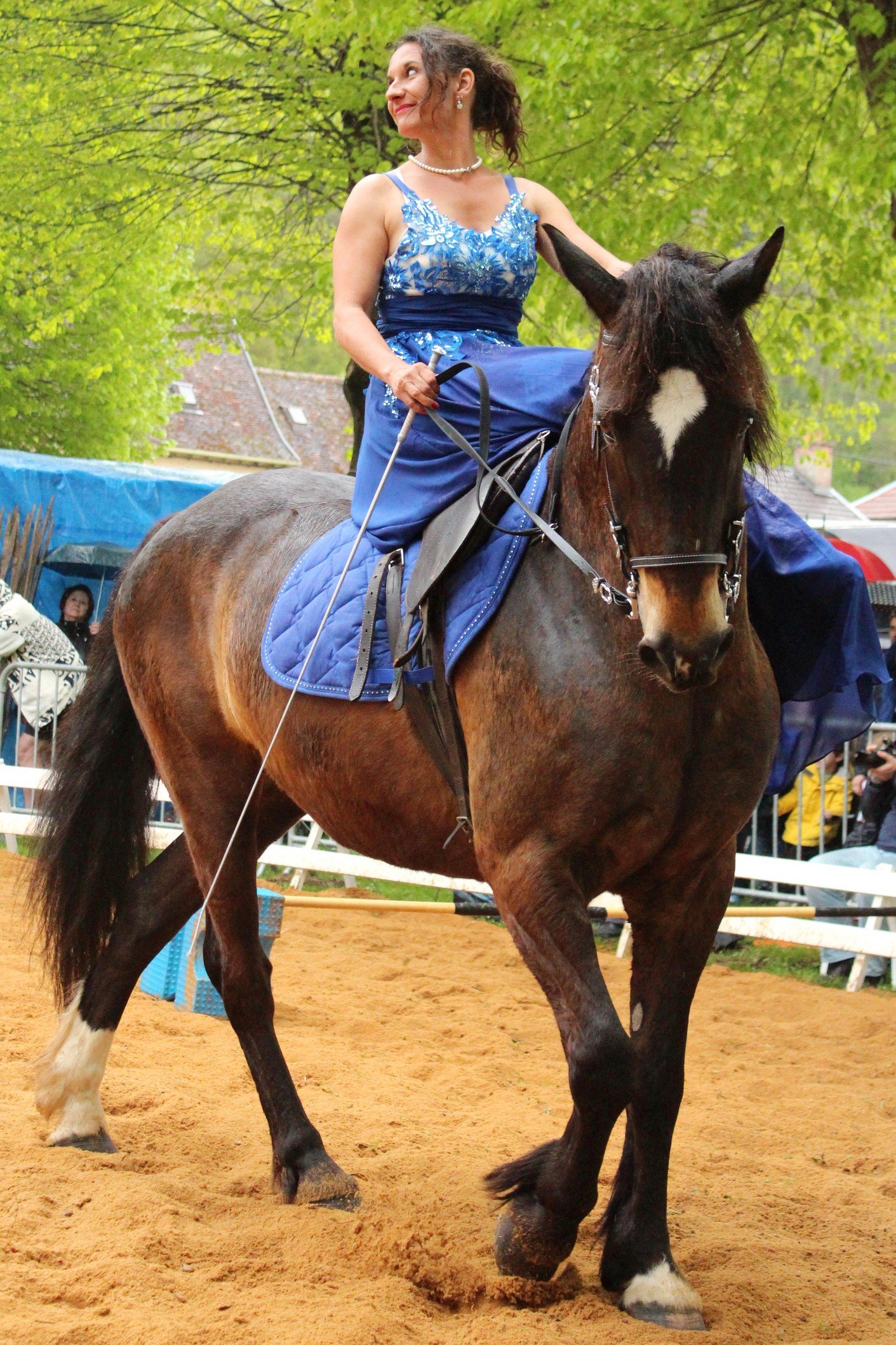 Dans la selle en amazone, la cavalière se tient de côté sur le cheval. Ses deux jambes reposent du même côté du cheval, généralement à gauche. Pour monter ainsi, on a besoin d’une selle d’amazone, qui a été développée spécifiquement pour ce type de monte.